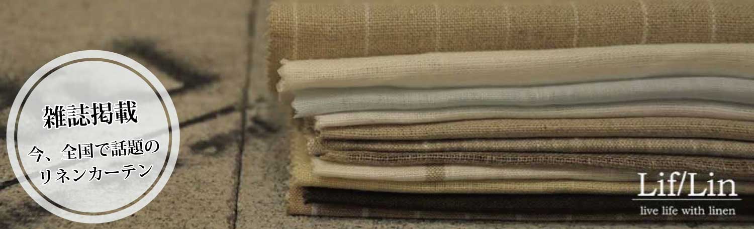 「Lif/Lin」リフリンのリネンカーテンは厳選したリネン100%をベース素材に使用しています。 リネンとはフラックスと呼ばれる植物の茎を原料とする麻の種類のひとつです。 麻の種類にはヘンプ(大麻)、ジュート(黄麻)、ラミー(芋麻)・・・だいたい20種類くらい。 麻と言うと「しわになりやすい」「かたくてゴワゴワした感じ」「ちくちくして肌触りがいまいち…」などといったイメージがありますが、それはリネン以外の麻のもの。 リネンはまったく違います。本当のリネンはやわらかくなめらかです。ほどよいしわ加減も風合いのひとつ。キッチンクロスやベッドクロスに使われることも多く肌触りも抜群です。 また天然素材リネンはお部屋の湿気を吸ったり吐いたり無垢の木と同じく呼吸しています。湿度が高いときは繊維に湿気を含み湿度が低いときは吐き出す。リネンが伸びたり縮んだりするのも呼吸をしているから。 使うほどに味わいが増し魅力がふえる魔法の布リネンで丁寧に仕上げたそれが「Lif/Lin」リフリンのリネンカーテンです。