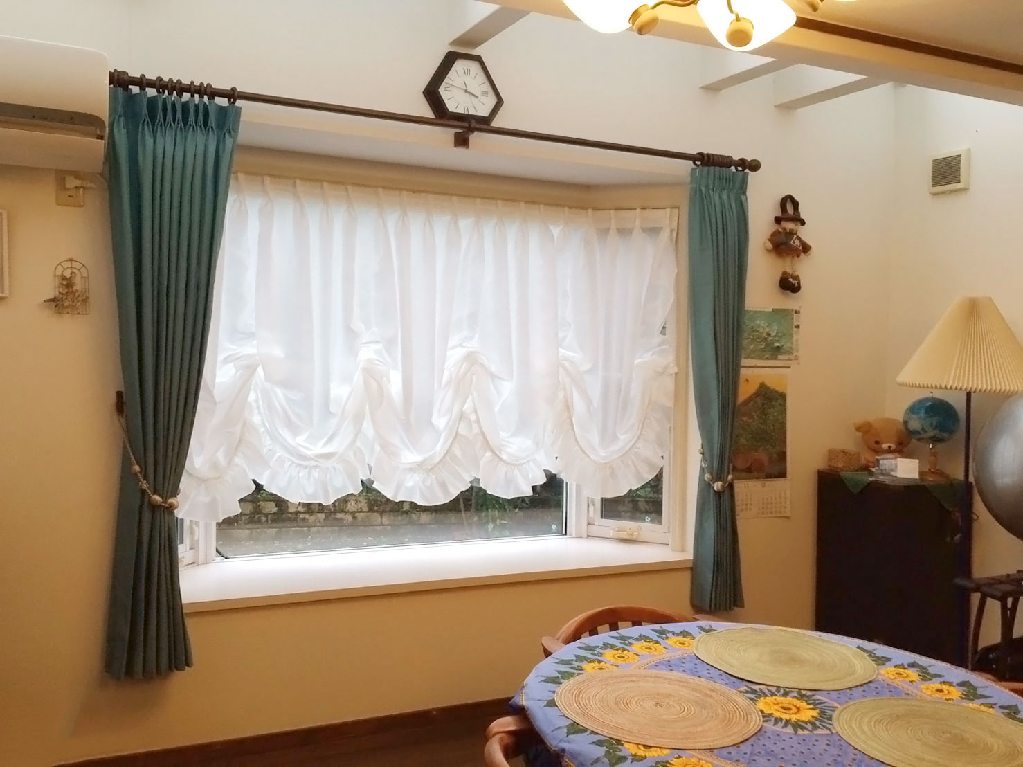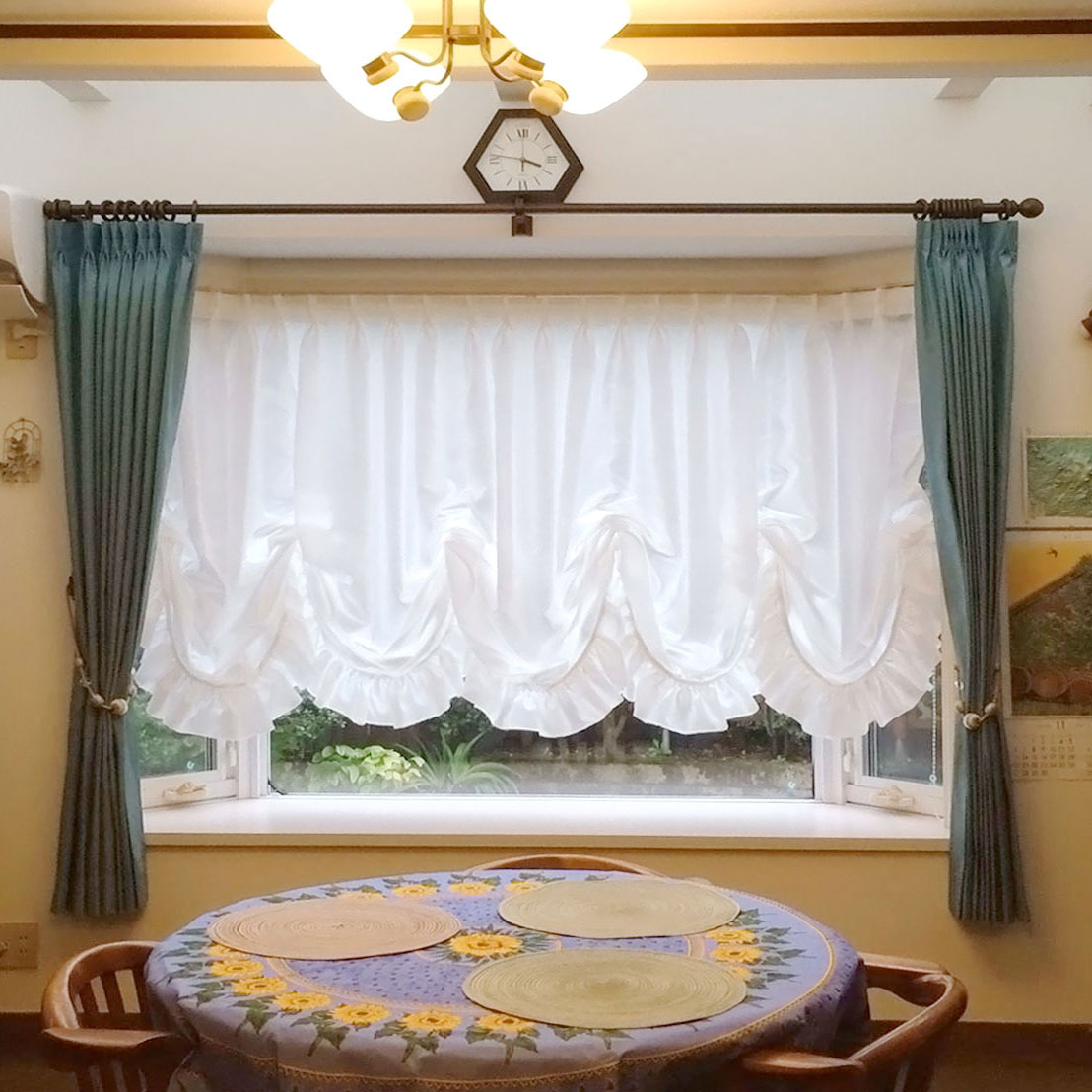 リビングの出窓のカーテンの付け替えでご来店いただきました。 当初はレースのプレーンシェードを付けられていましたが、バルーンシェードに変えたいとのことでした。 外からの視線が気になるとお悩みだったので、バルーンシェードの生地には遮像ボイルを採用。この生地は特殊な繊維構造により光を乱反射させ、昼はもちろん夜も室内の様子を外部からわかりにくくしてくれます。 フリルの長さや、ヒダの取り方、スワッグの数などはお客様と一緒に打ち合わせをして決定しました。 ドレープ生地には、お部屋に伺った際とても素敵なブルーのステンドグラスがあったので、それに合わせて、発色の綺麗なブルーの輸入生地をご提案。落ち着いた色合いですっとお部屋に馴染み、とても気に入っていただけました。 レールは、お部屋の優しい雰囲気に合わせて木製のものに。レールの上部に飾られている時計は、ご友人から貰った思い入れのある時計とのことで、隠してしまわないようレールは枠ギリギリに取り付けました。 インテリアがお好きな方で色んなお話を聞かせて頂き、打ち合わせから取り付けまでとても楽しい時間でした。