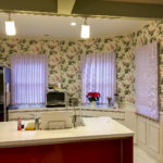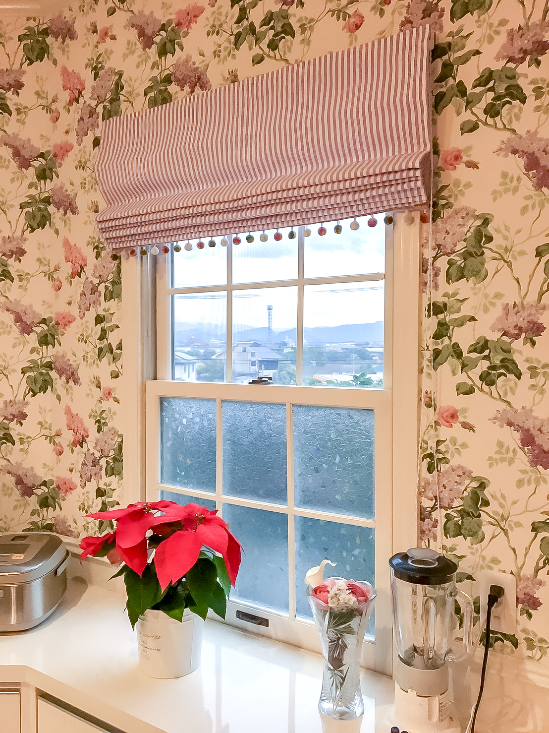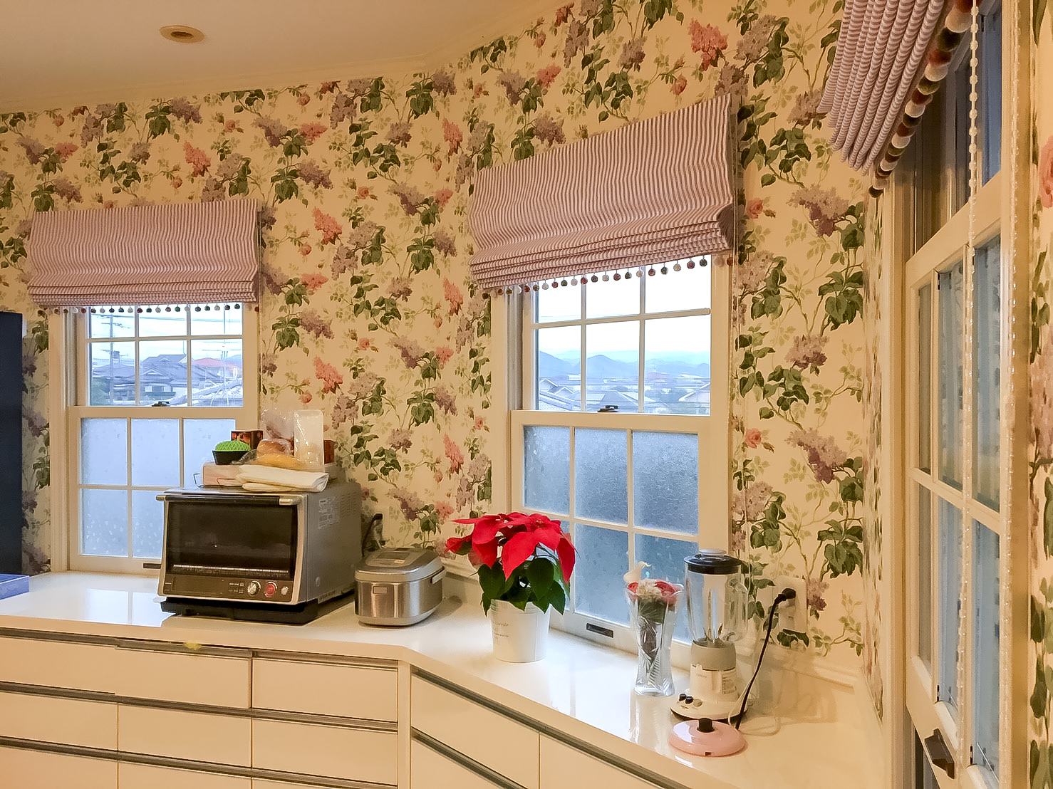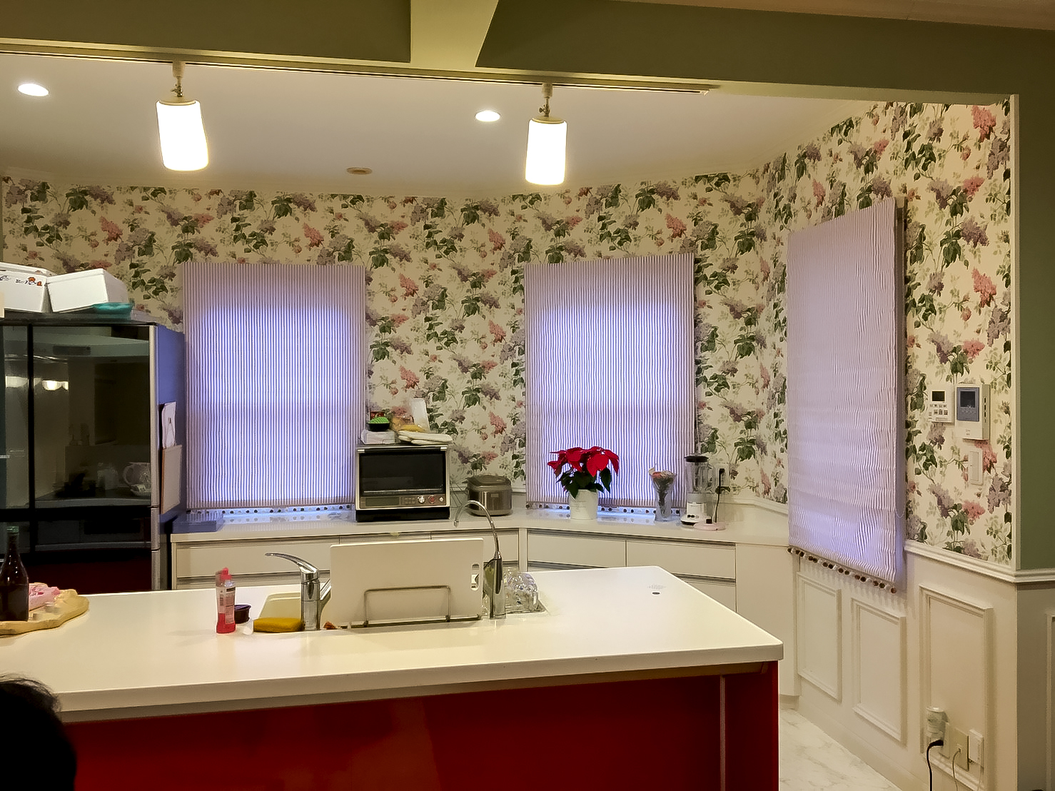 キッチンスペースの3連の上げ下げ窓にプレーンシェードをお取り付けしました。