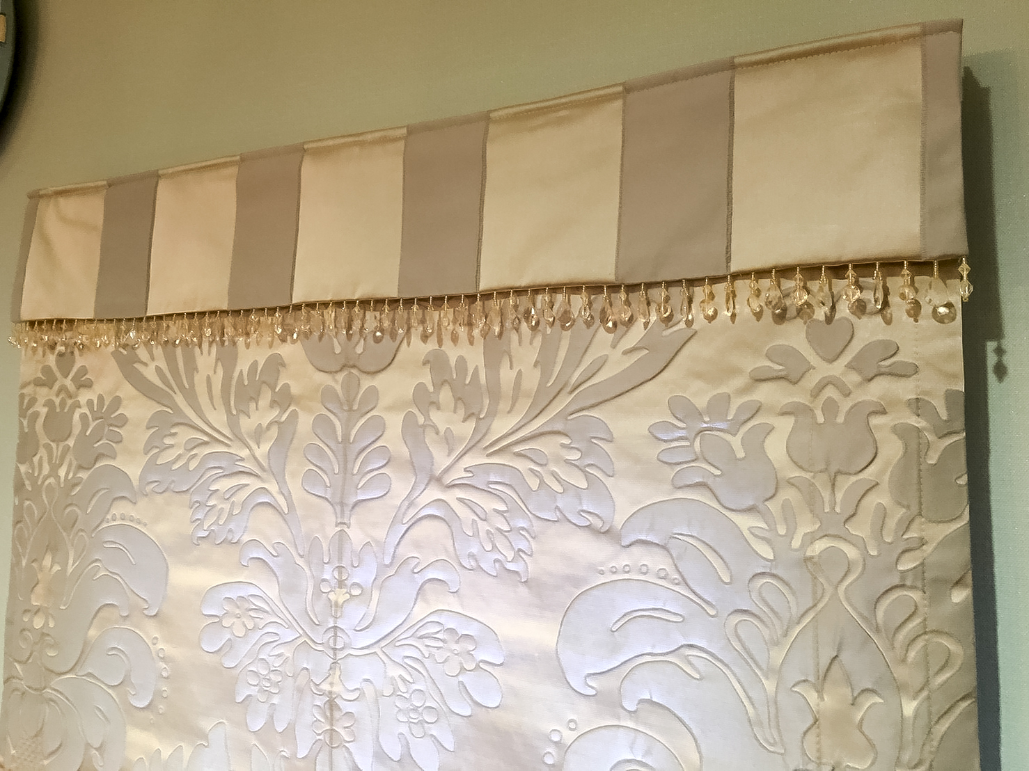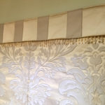 ストライプの生地に、裾にはカラフルなポンポンフリンジを付けて、、