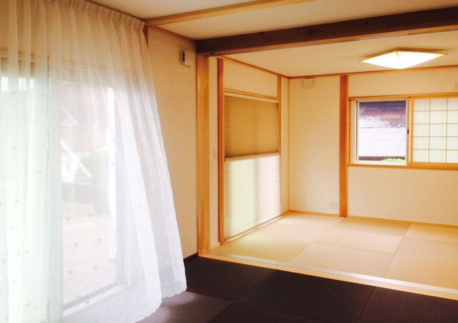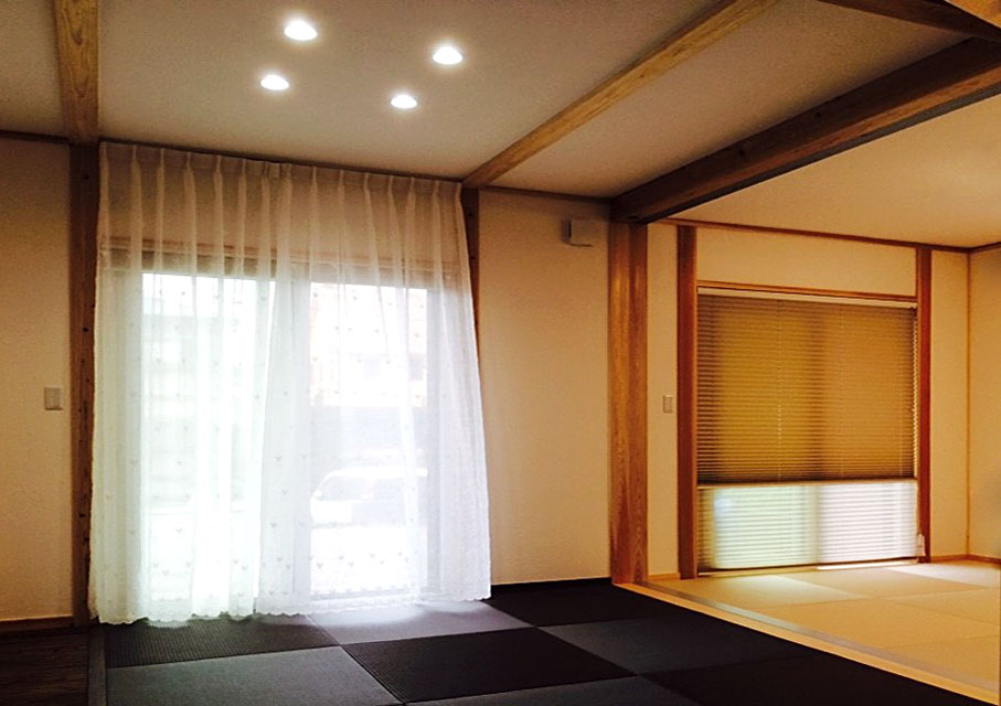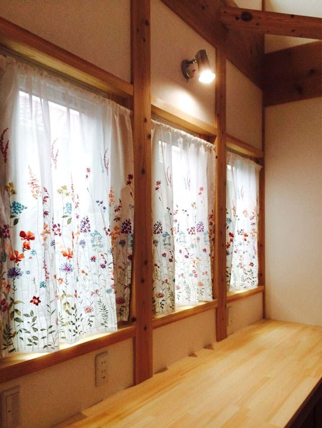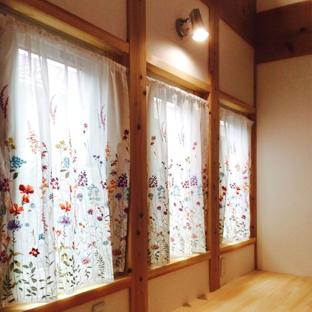 新築戸建を建設中ということで、比較的早い段階でご来店いただきました。 図面を拝見し、いかに空間を広く演出するか、洋の雰囲気を活かしつつ和室への繋がりをどのように魅せるか。という事を意識してご提案させて頂きました。 また、奥様に気に入っていただいた刺繍レースカーテン。生地幅をうまく使うことで、キッチン横にある3つの腰高窓に生地を無駄なく取り付けることができました。