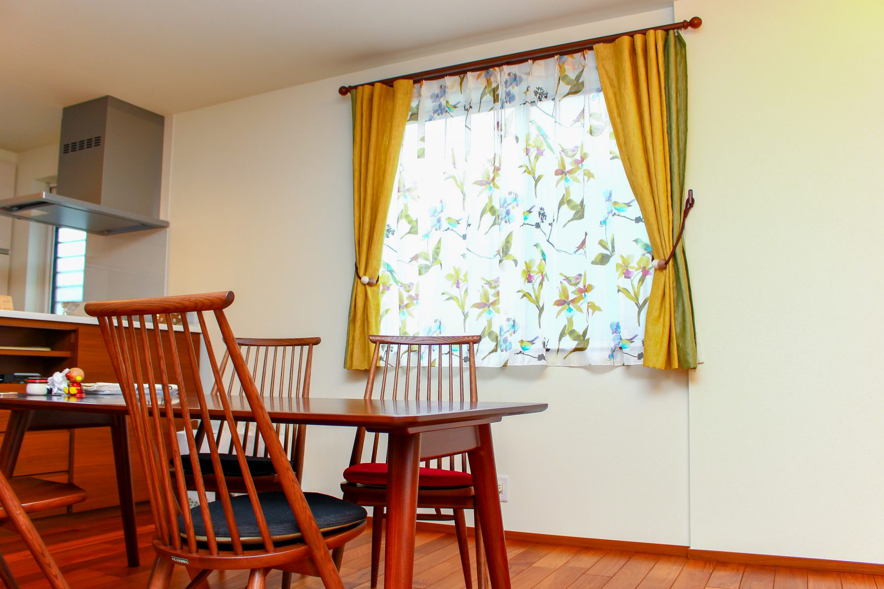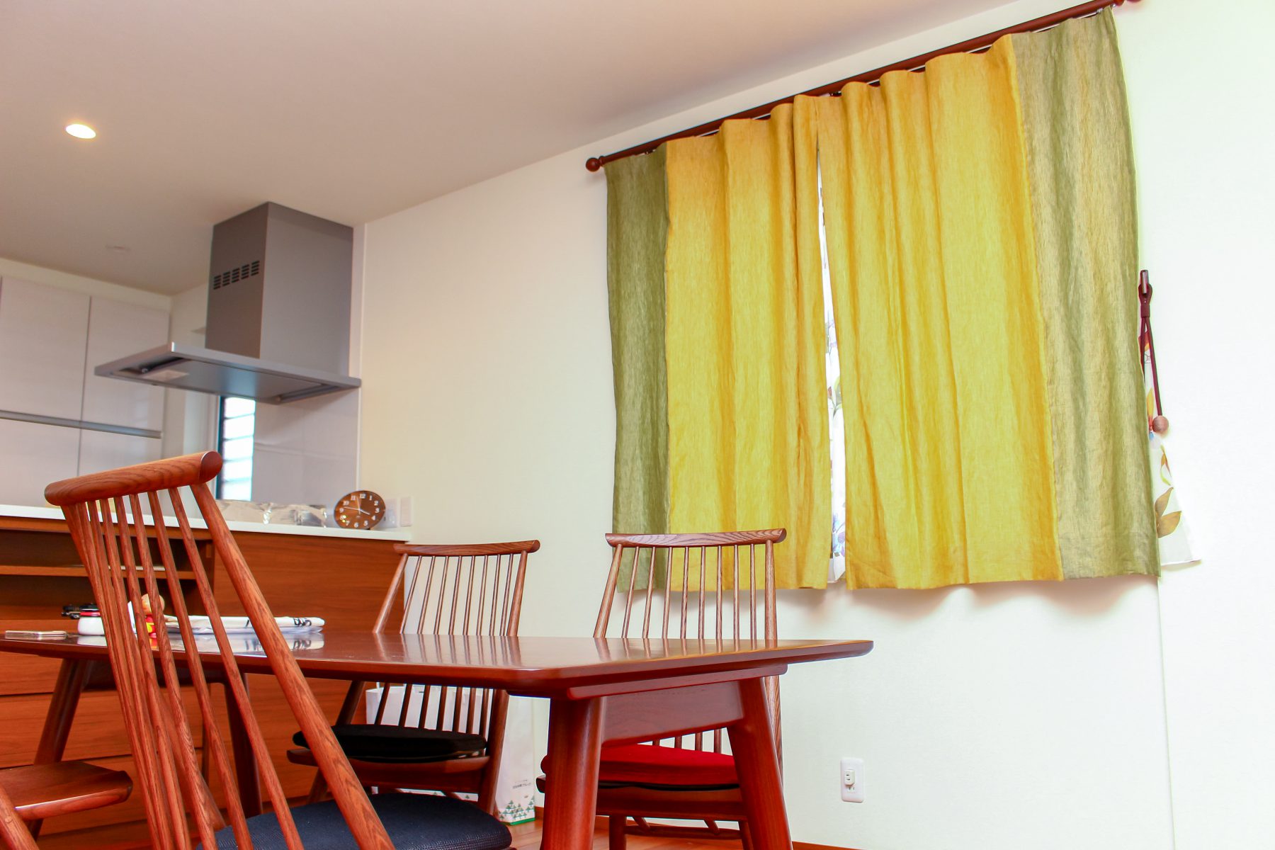 リビングにリネン100%の生地で、優しい雰囲気ながらも、黄色と緑のカラフルな色合いで、落ち着きすぎないお洒落な空間になりました♪