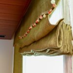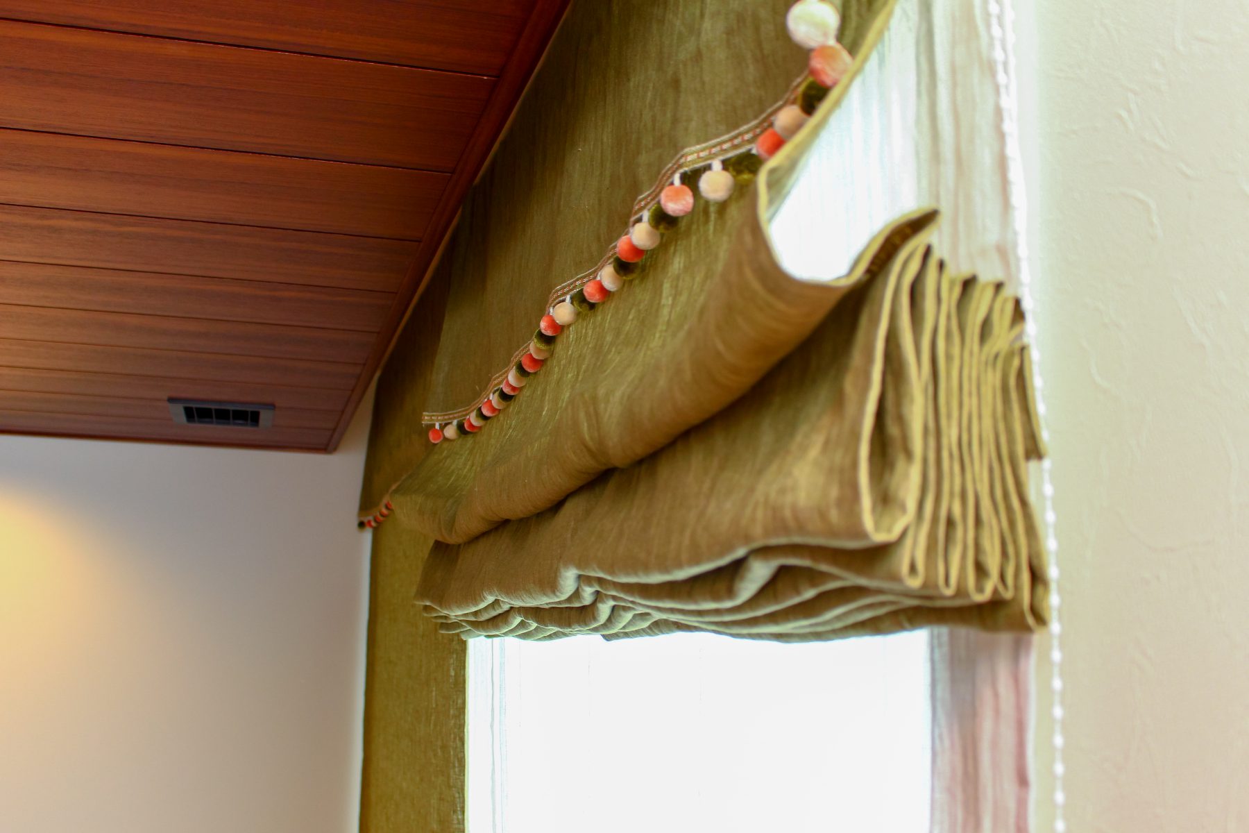 腰窓のドレープは、黄色と緑の生地を切り返して、単調な無地にならず、デザイン性を持たせています。
