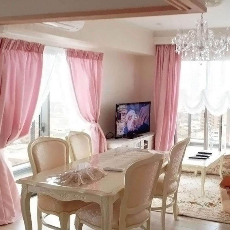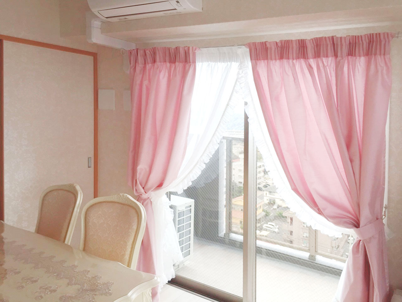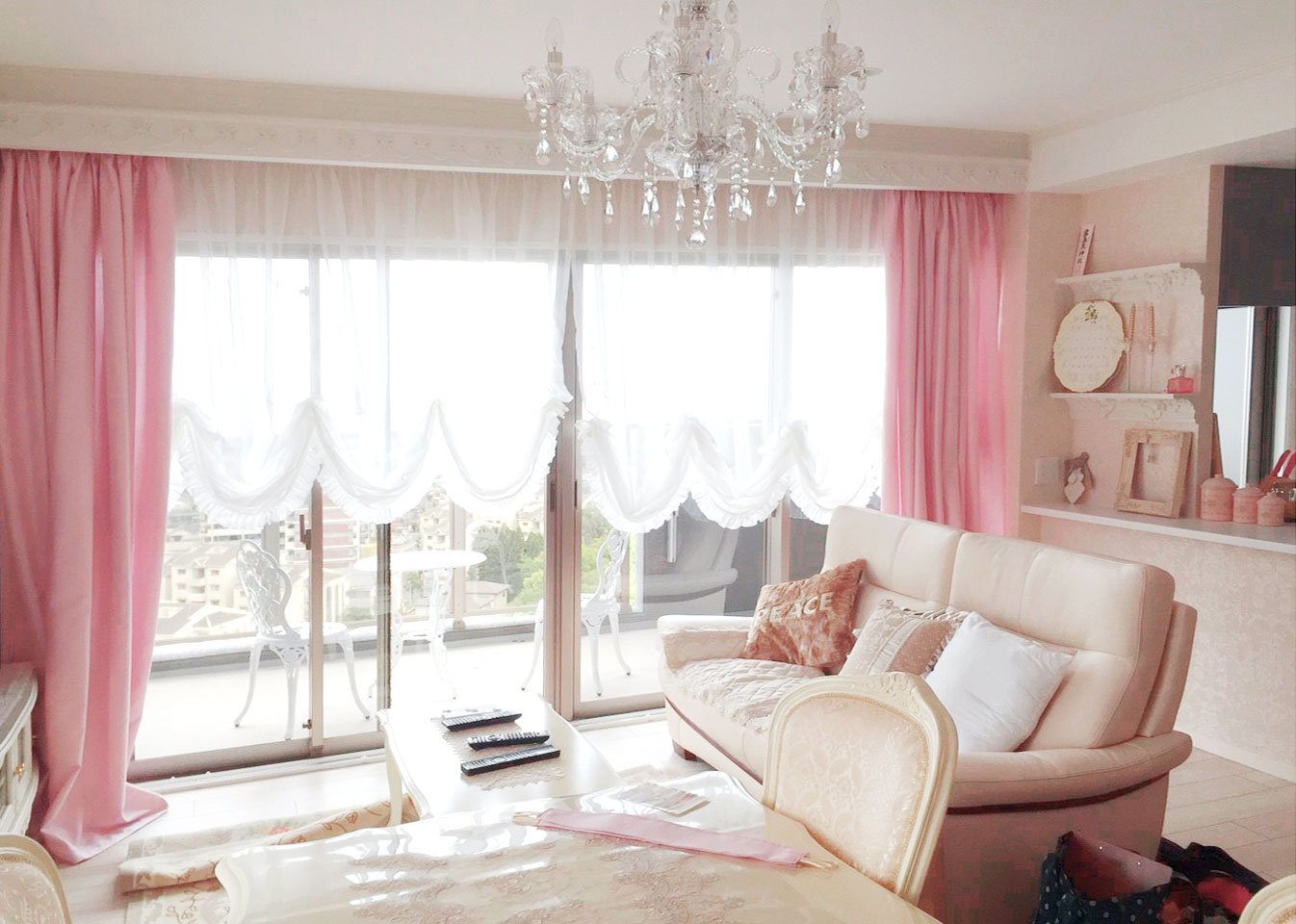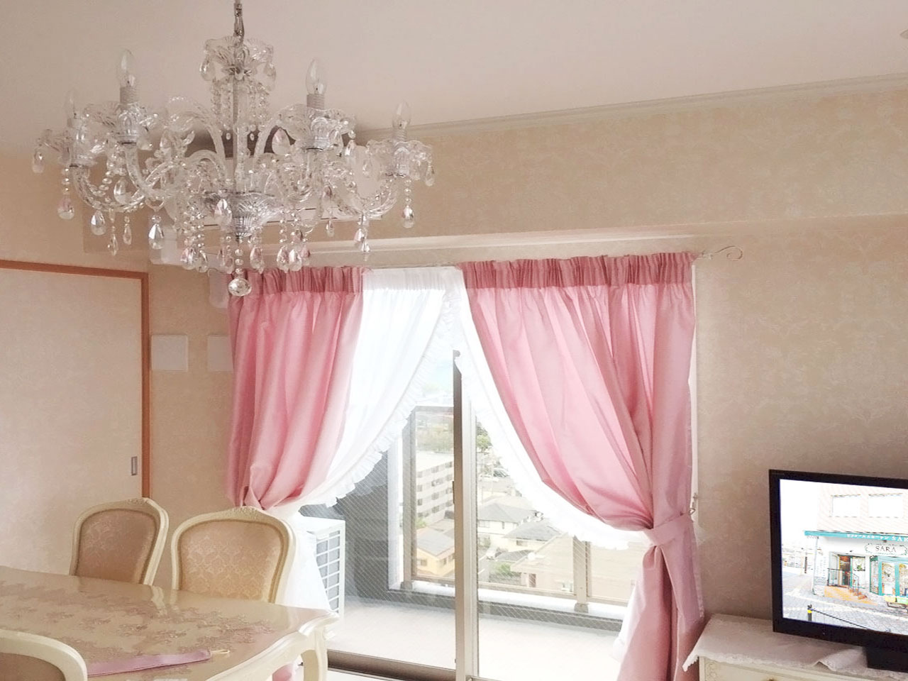 「シャンデリアに合う空間」をテーマに、メインの窓は、幅が大きいことから調光など使い勝手が良い様バルーンシェードを2台に分け、生地はボリューム感の出る柔らかいシアーカーテンをセレクト。 お部屋には、サンメントなど様々なインテリアアクセントが設けられており、手前のドレープカーテンに柄ものを使うとゴージャス過ぎてしまう為、シンプルながら色合いが美しく、ドレープラインが深くゆったりと出る生地をギャザーカーテンを採用しました。 ドレープカーテンは敢えて裾丈を長く仕上げ、ブレイクさせるスタイルに。 もう一つの左手掃き出し窓にも、フリルで装飾したレースを取り付けることでデザインに統一感をもたせています。クロスオーバースタイルで取り付けを行うことで、いつでも鹿児島の街並みを眺望出来るようにしています。