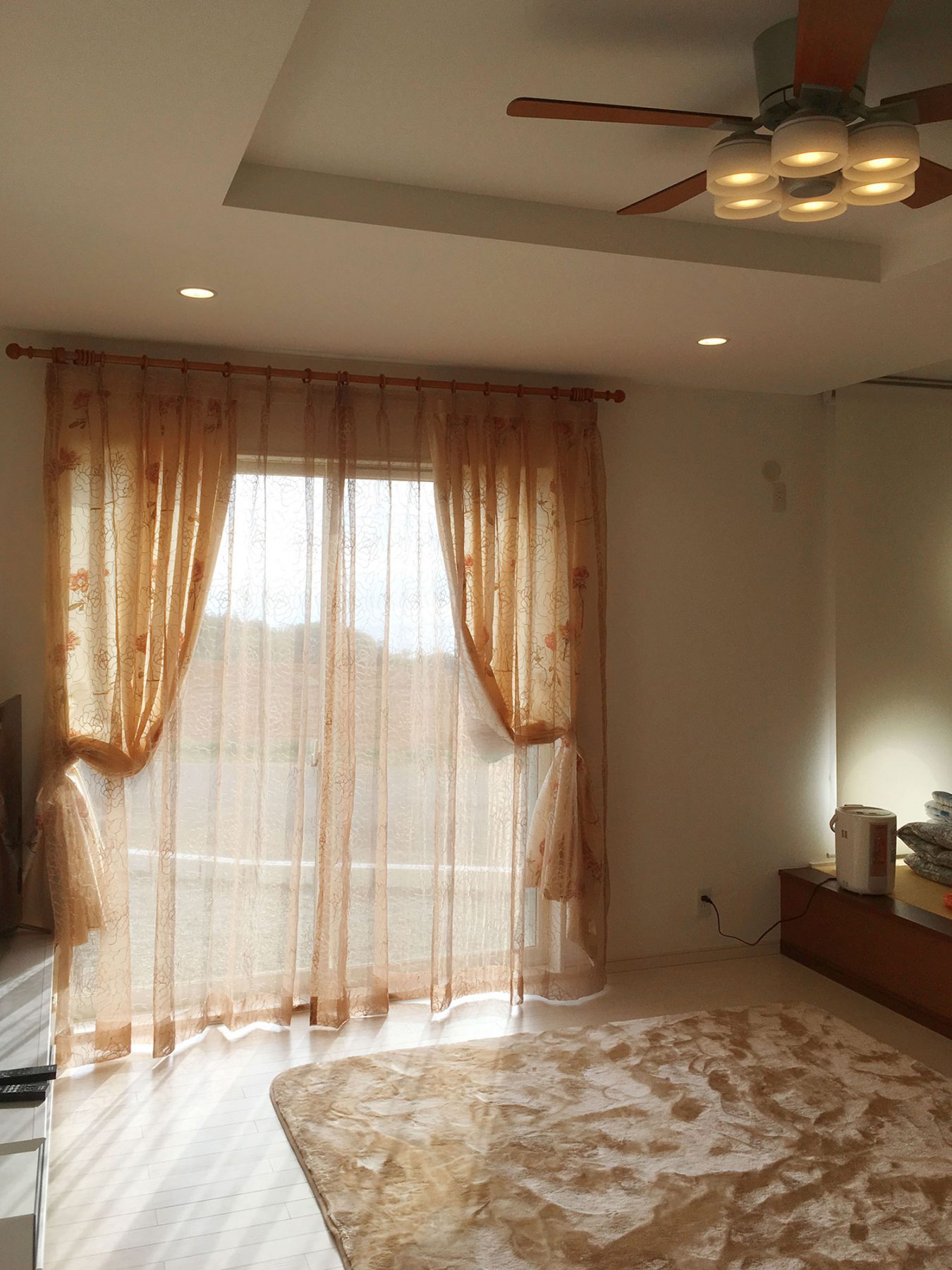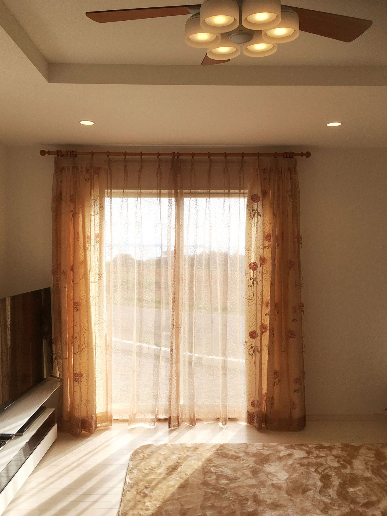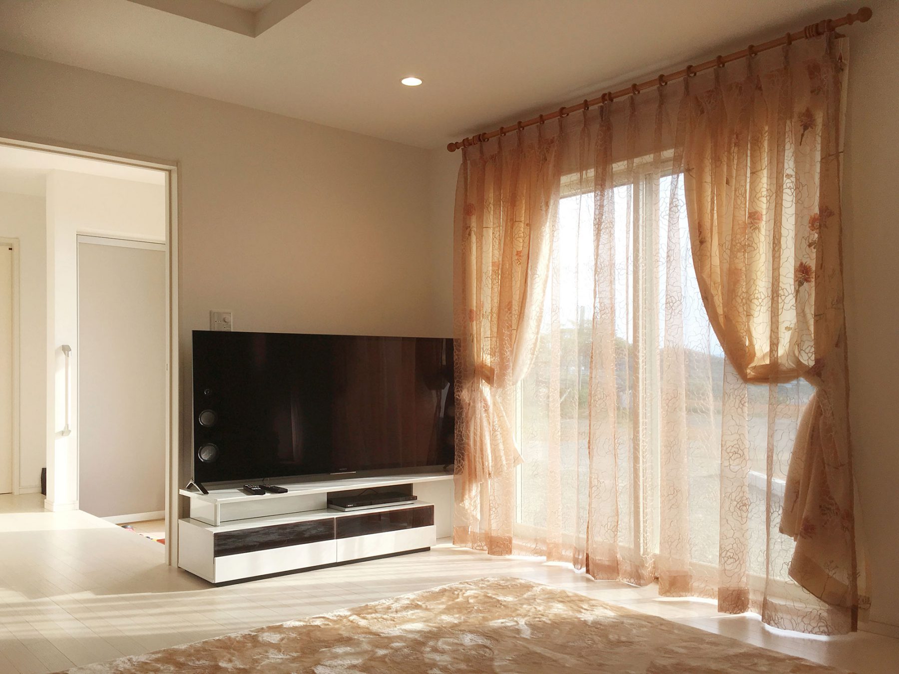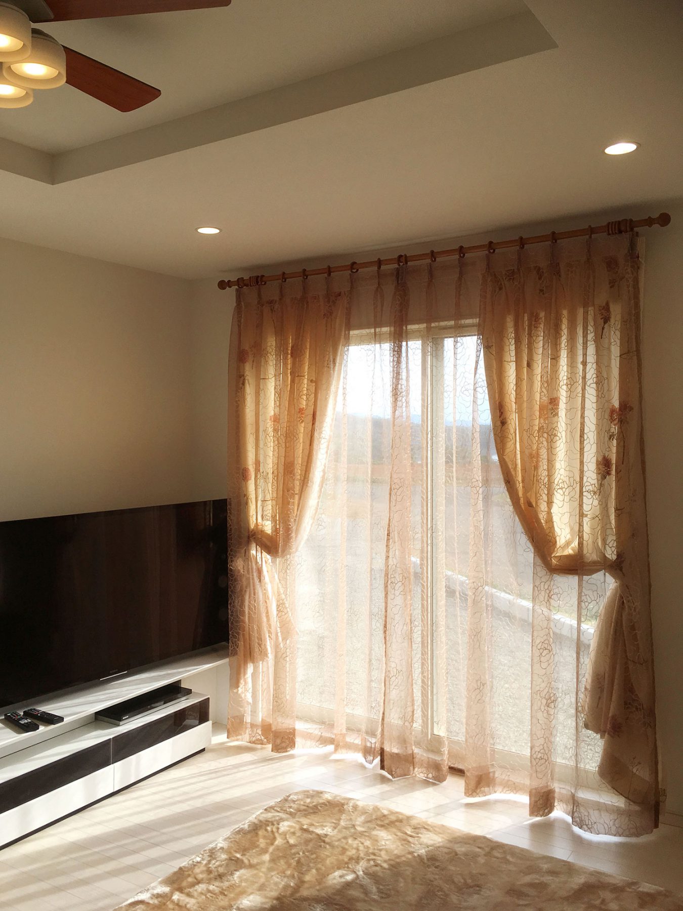 お店に展示しているレースカーテンをとても気に入っていただきましたが、果たしてそのレースカーテンがお家の合うのか。との不安をお持ちでした。 詳しくお家について伺うと、内装は白でまとめているとの事でリビングの写真を見せていただきました。