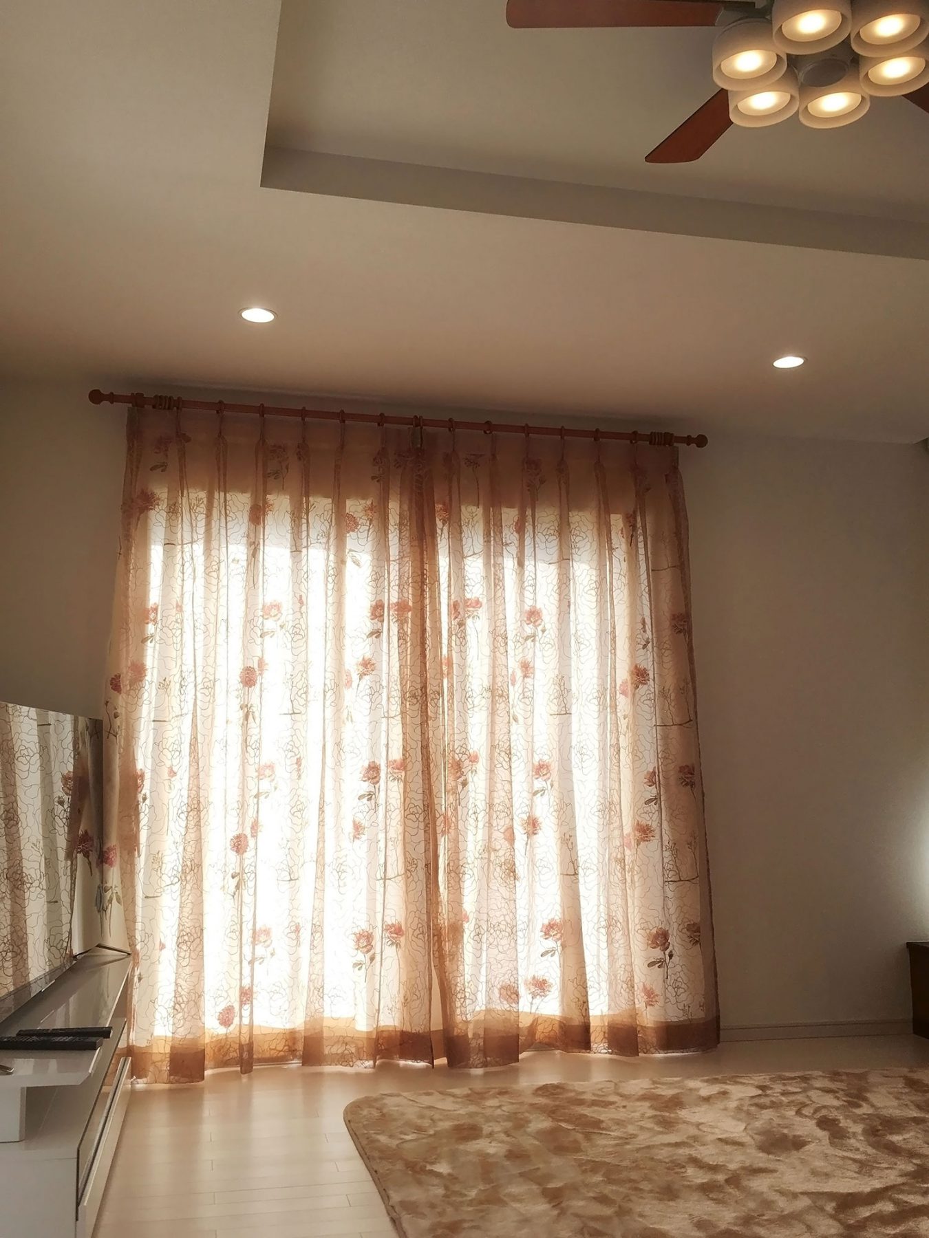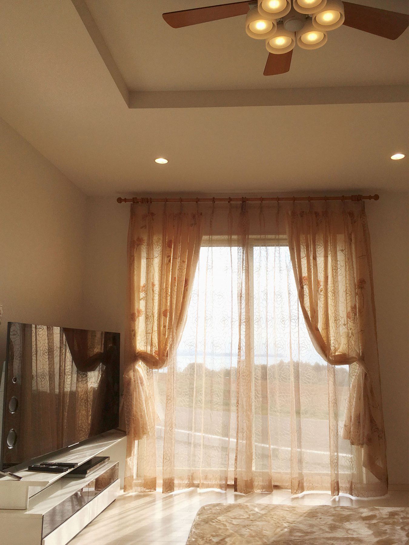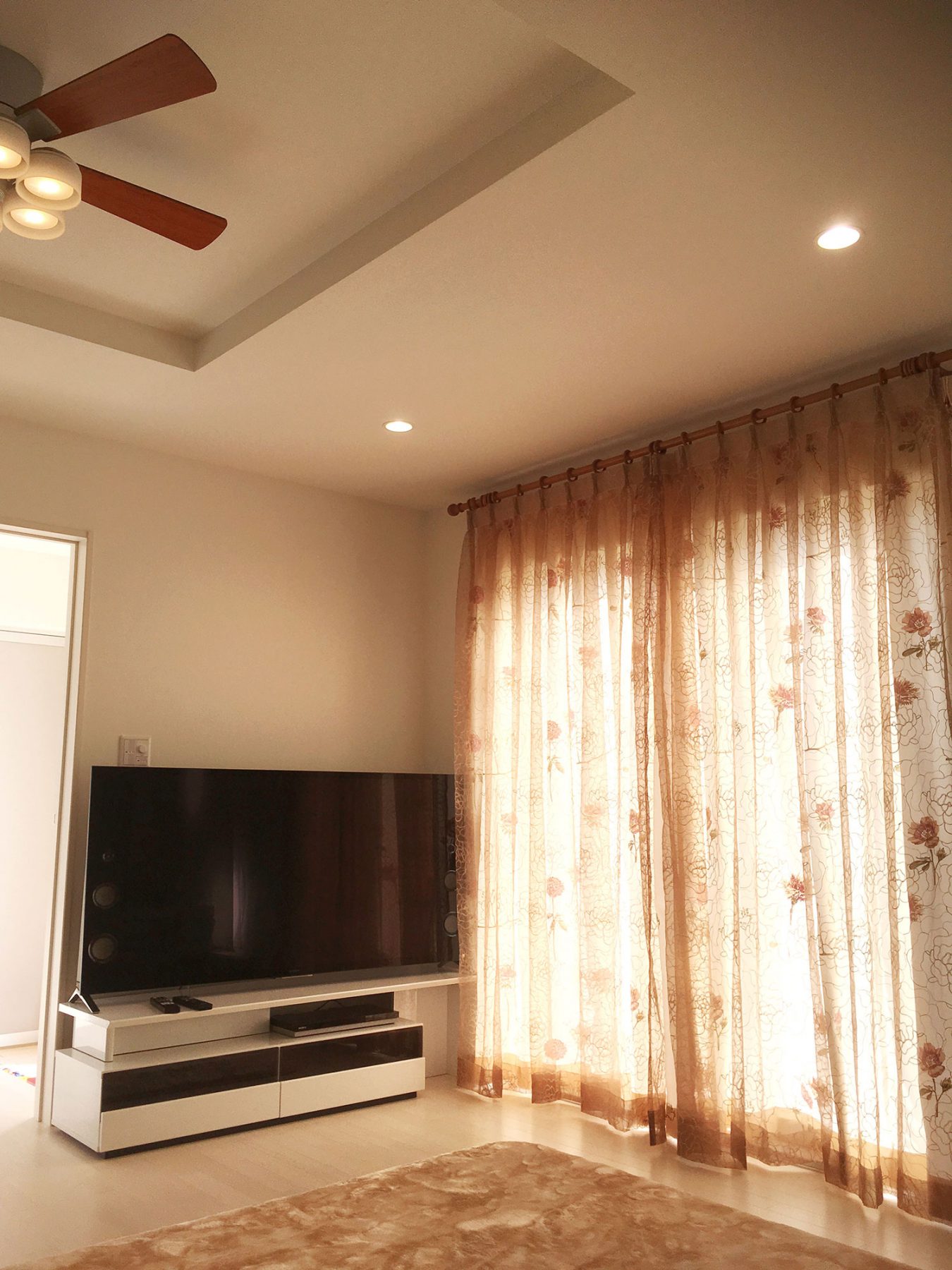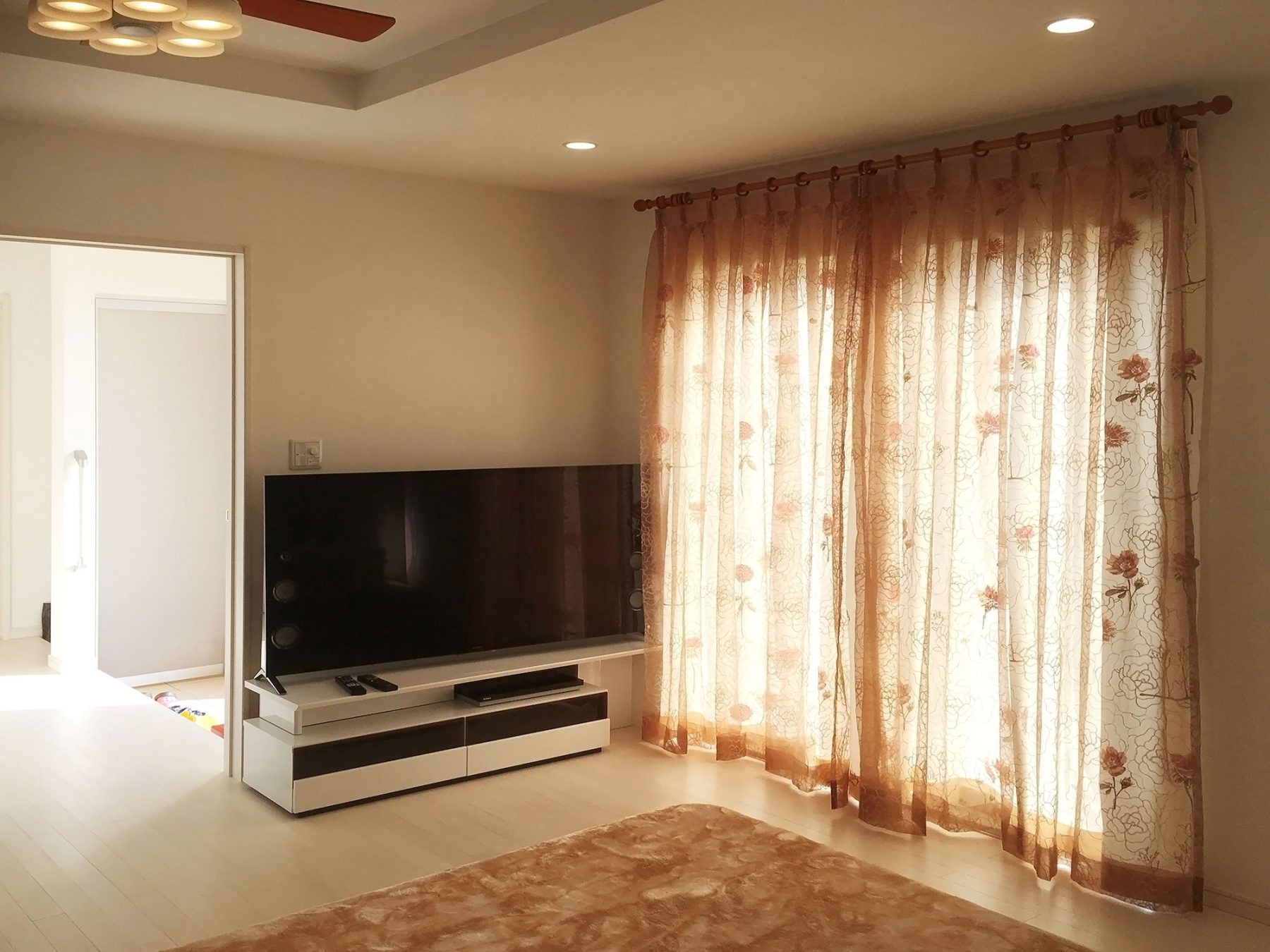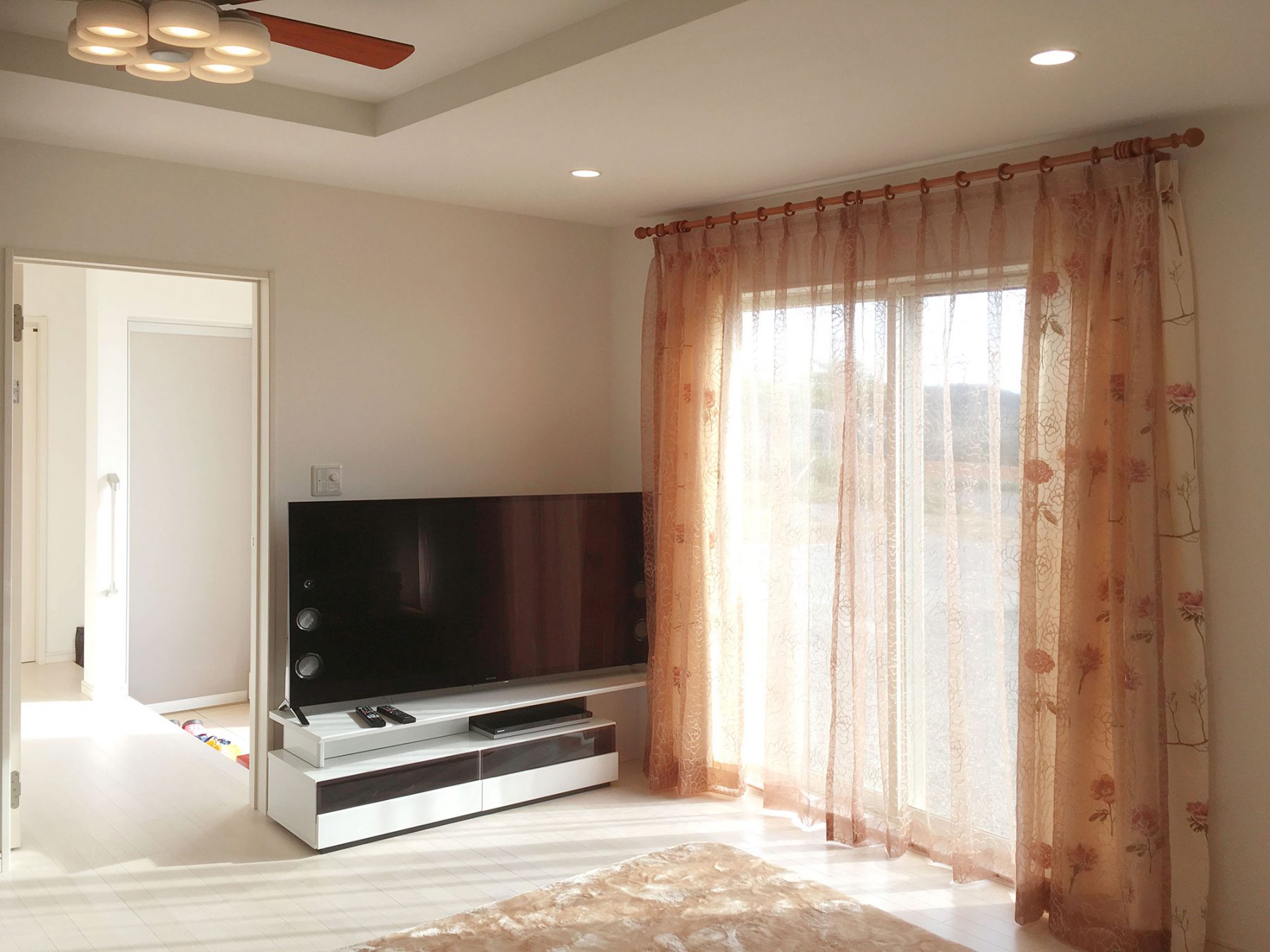 お店に展示しているレースカーテンをとても気に入っていただきましたが、果たしてそのレースカーテンがお家の合うのか。との不安をお持ちでした。 詳しくお家について伺うと、内装は白でまとめているとの事でリビングの写真を見せていただきました。