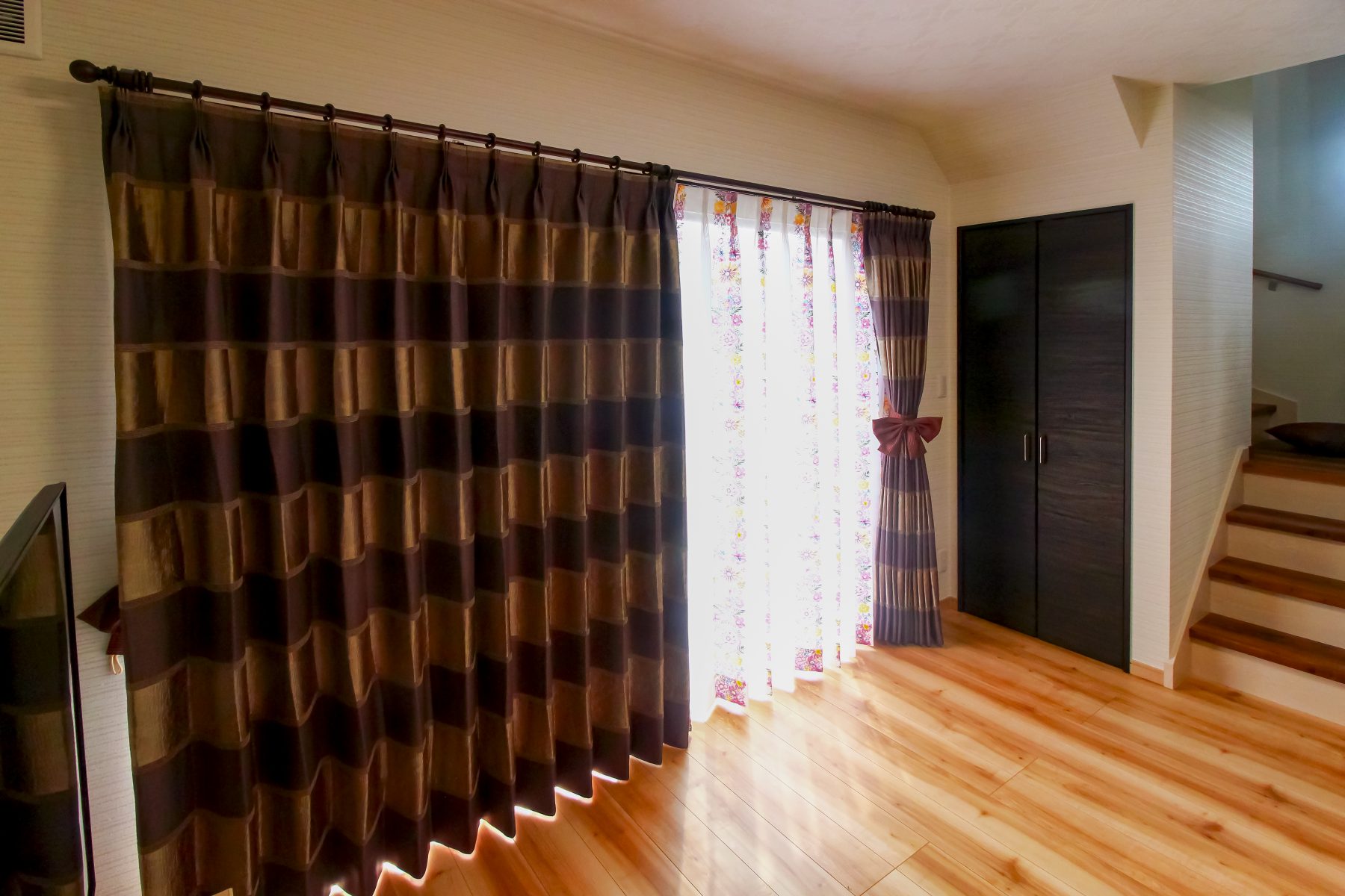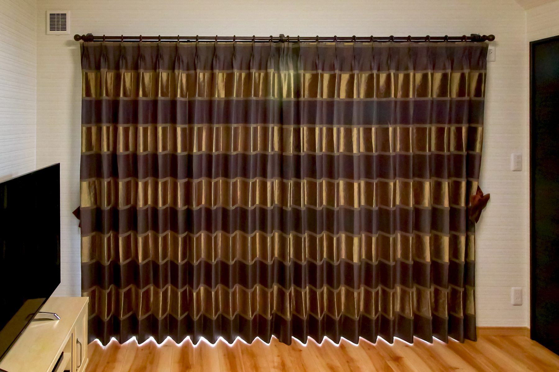 夜はダークにかっこいいボーダーのカーテンを付けさせて頂きました。
