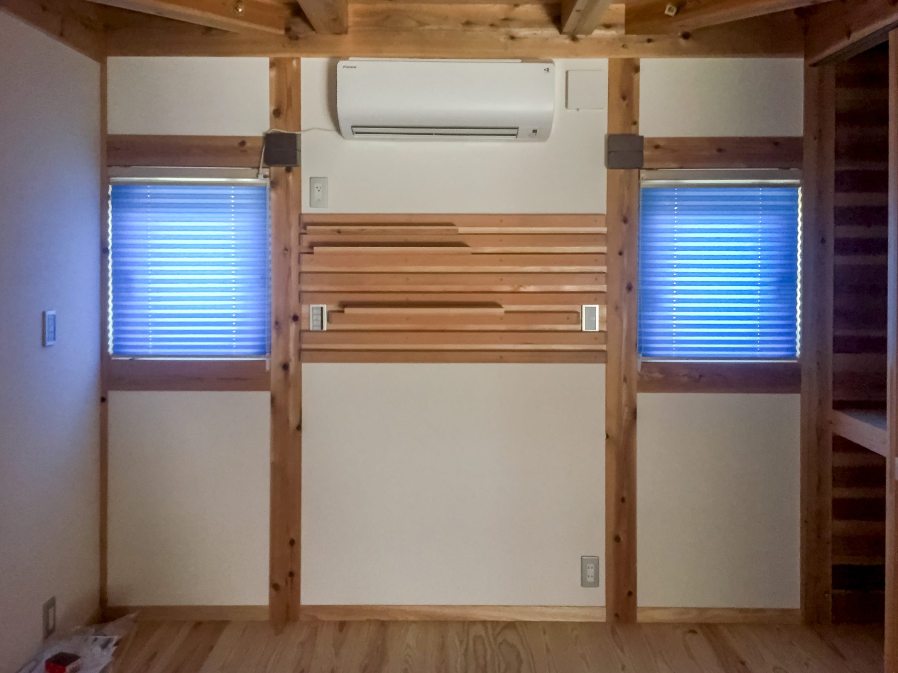 そんな空間に、ブルーを基調とした、小窓にはプリーツスクリーンとフラットの無地のカーテンを取り付け致しました。