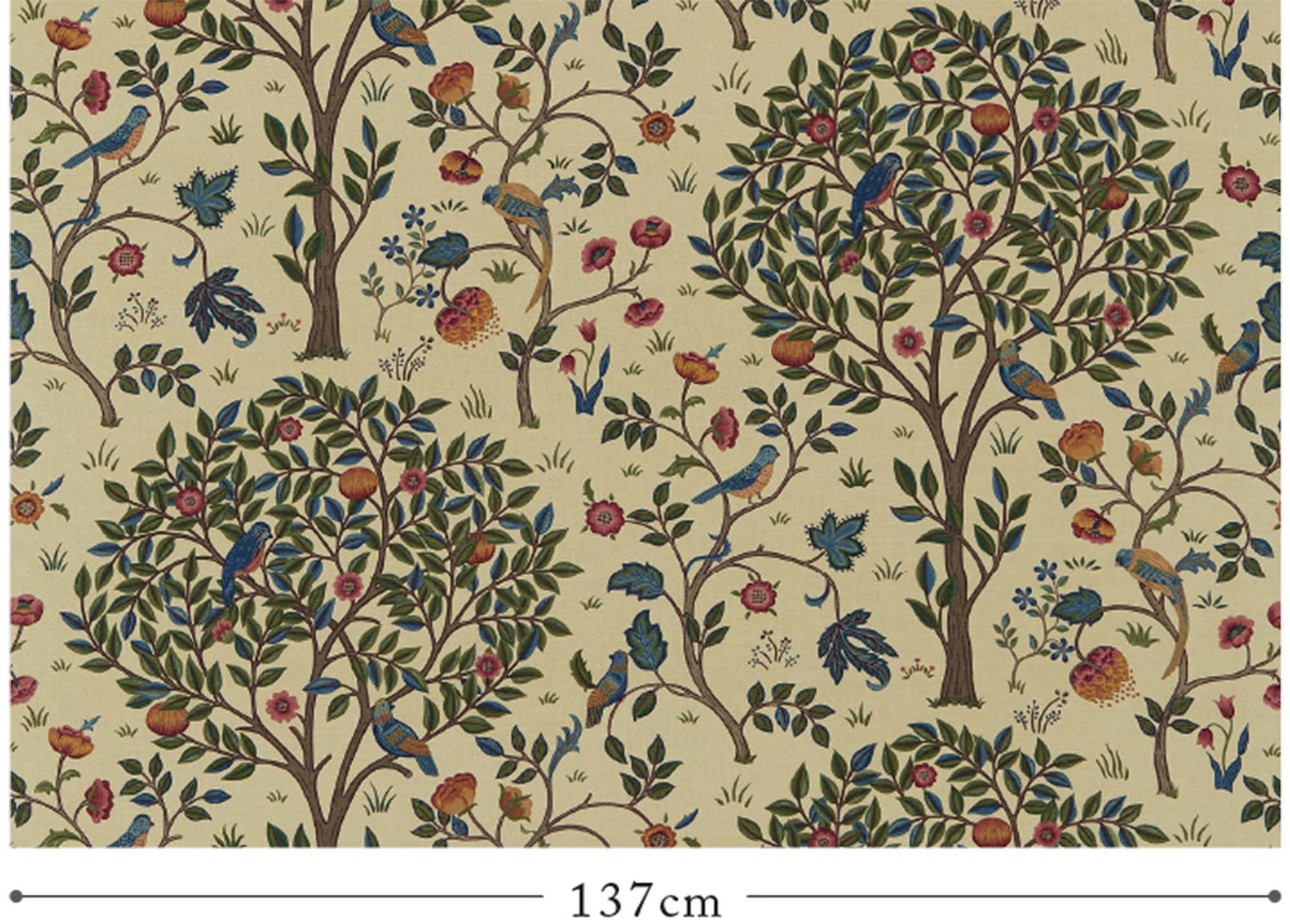 この鳥と花々に囲まれた大きな木のデザインは、モリスの夏の別荘ケルムスコット・マナーのモリスの寝室にある四柱式寝台を囲むカーテンからインスパイアされ、現在のモリス・スタジオのデザイナー/アリソン・ジーによって描かれました。